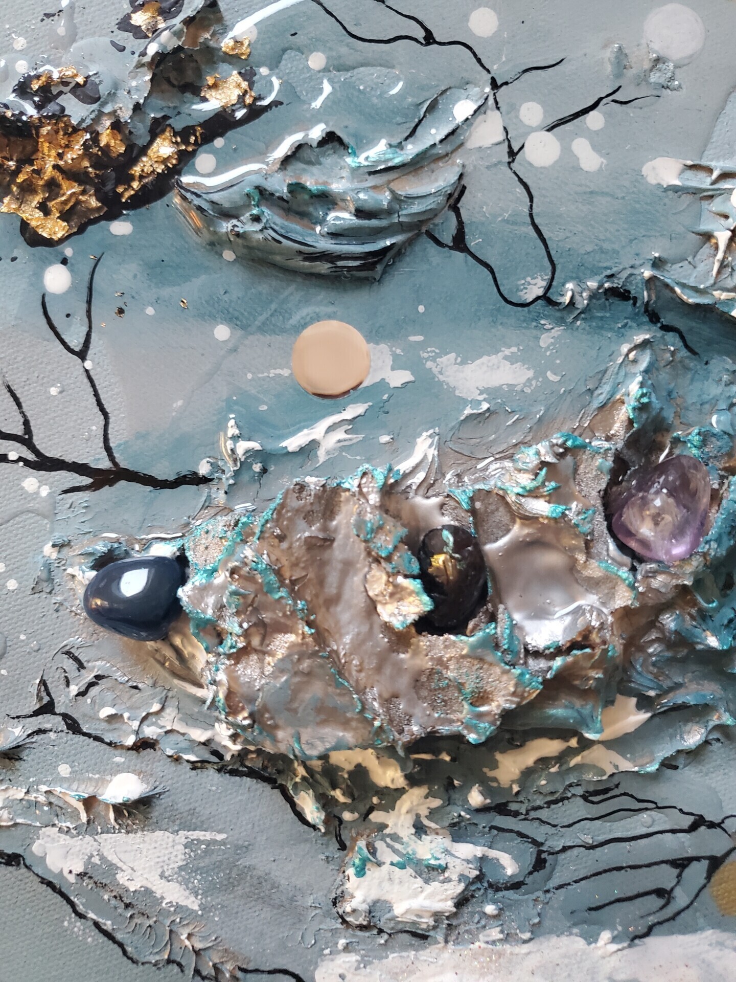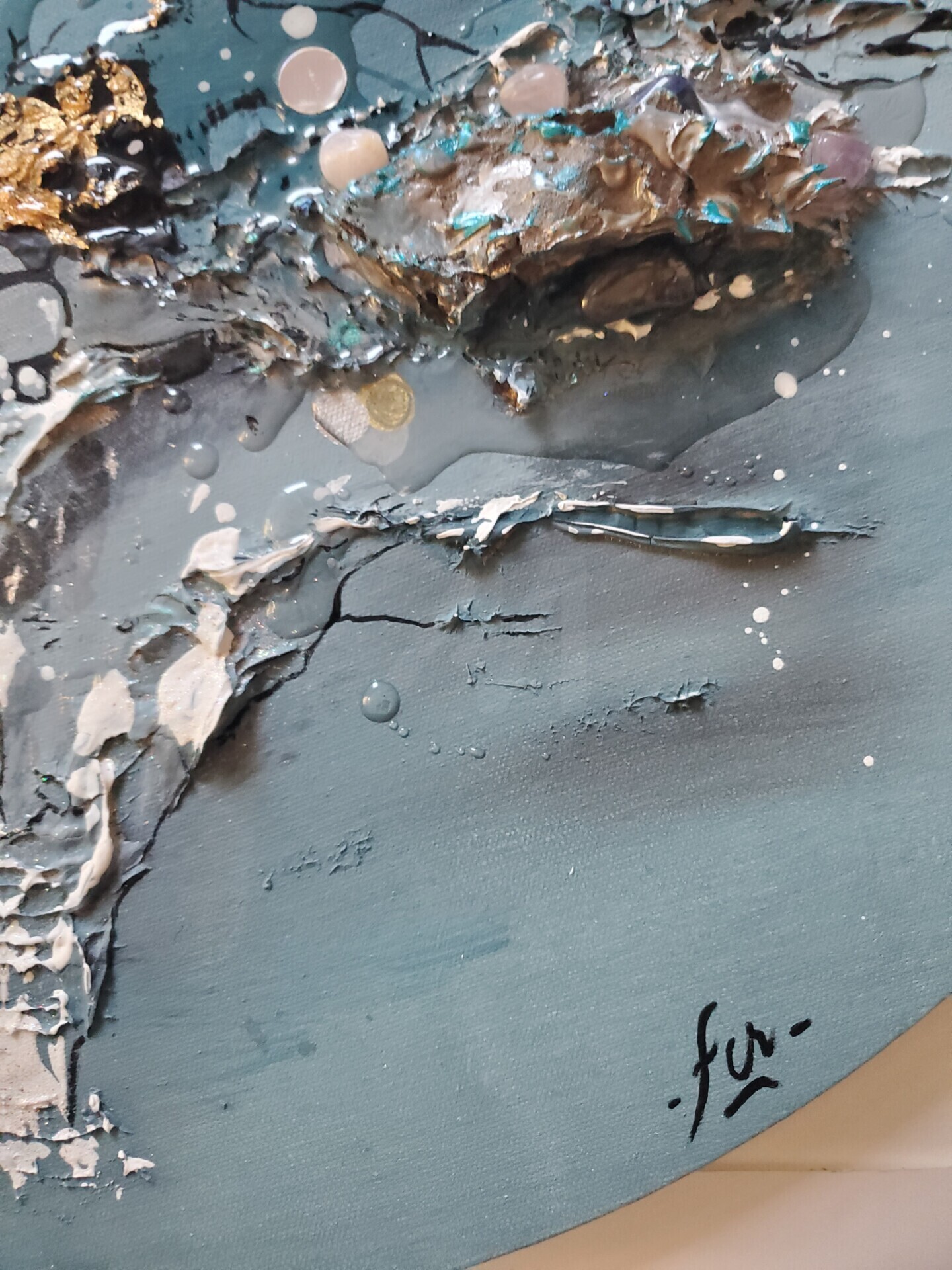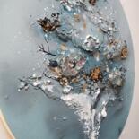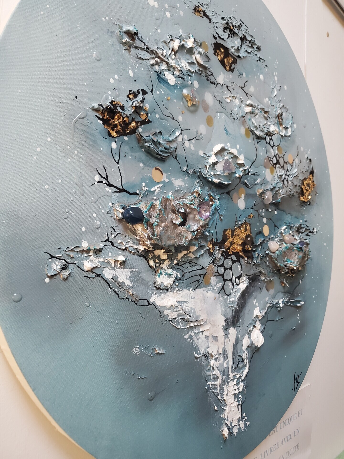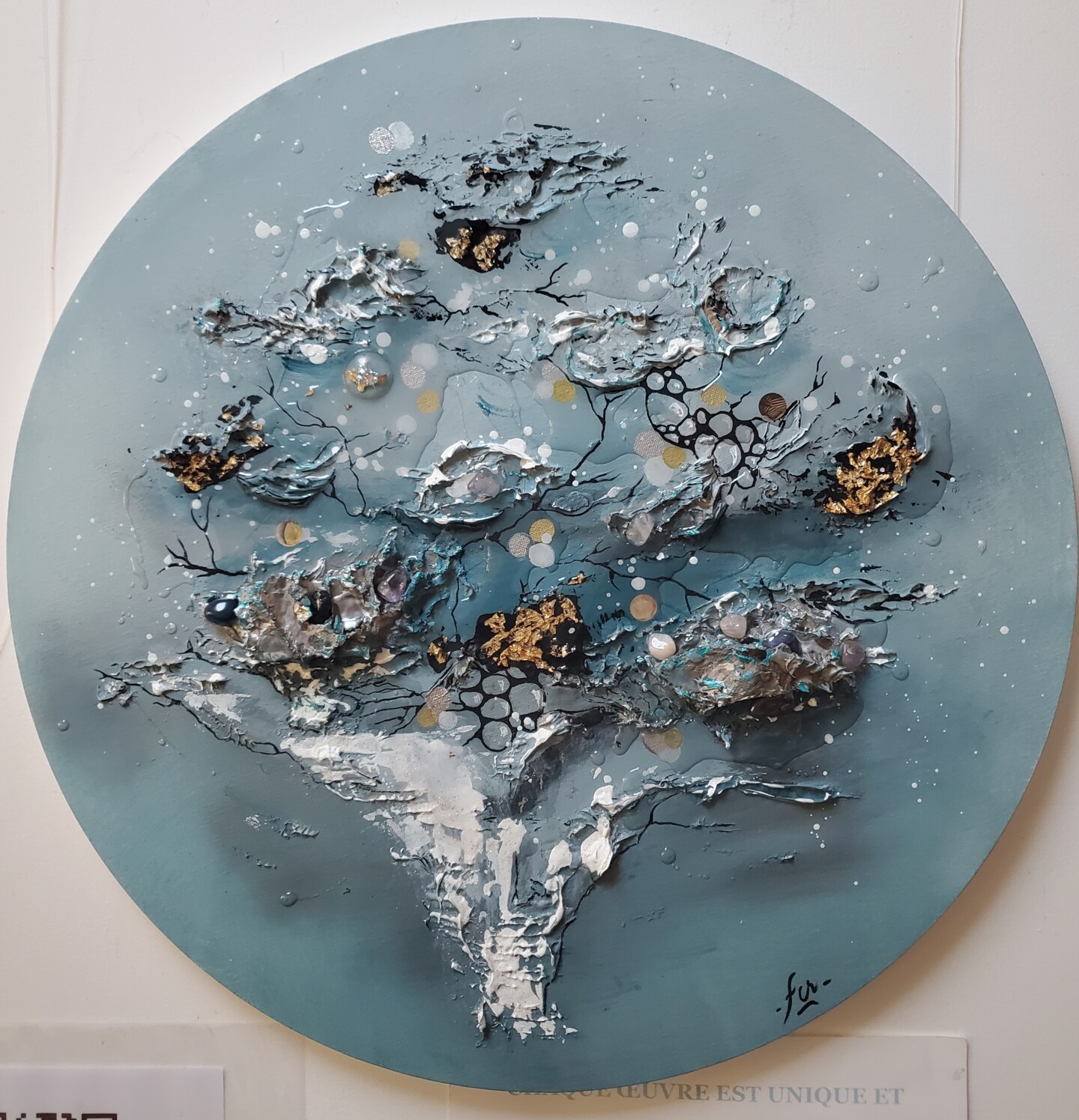 Tondo réalisé en 3D technique mixte avec matières naturelles (morceaux de nids de frelons consolidés avant pose entre autres), Feuilles d'or, résine et pierres fines.